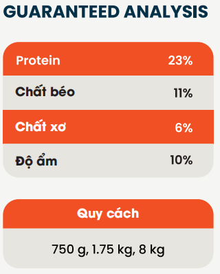 Bột thịt gia cầm, Bã mì sắn, Ngô, Gạo tấm, Cám gạo tách dầu, Bột đậu nành, Thịt gà, Mỡ bò, Gạo lứt, Chất tạo hương, Dầu gà, Đậu nành toàn phần, Dầu cá hồi, Men bia, Canxi cacbonat, Bổ sung khoáng chất vi lượng thiết yếu (Sắt, Kẽm, Đồng, Mangan, Iốt, Selen), Phosphate monocalcium, Vitamin C, Bổ sung vitamin thiết yếu (Vitamin A, Vitamin D3, Vitamin E, Acid Nicotinic, Vitamin B1, Vitamin B6, Acid Pantothenic, Vitamin B2, Vitamin K3, Acid Folic, Biotin, Vitamin B12), Choline Chloride, Methionine, Kali Clorua, Vitamin E, Fructo-Oligosaccharide, Chiết xuất Yucca Schidigera, Sụn ức gà, chất tạo mùi (xông khói )